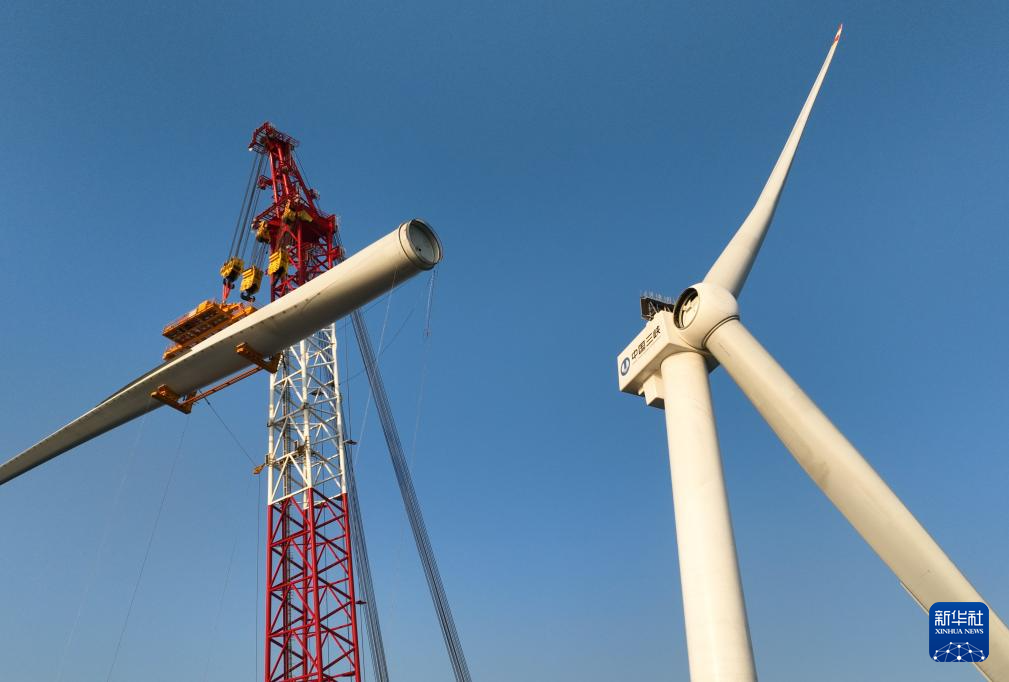 1月13日,20兆瓦风电机组第三片叶片在吊装中(无人机照片)。新华社记者 林善传 摄