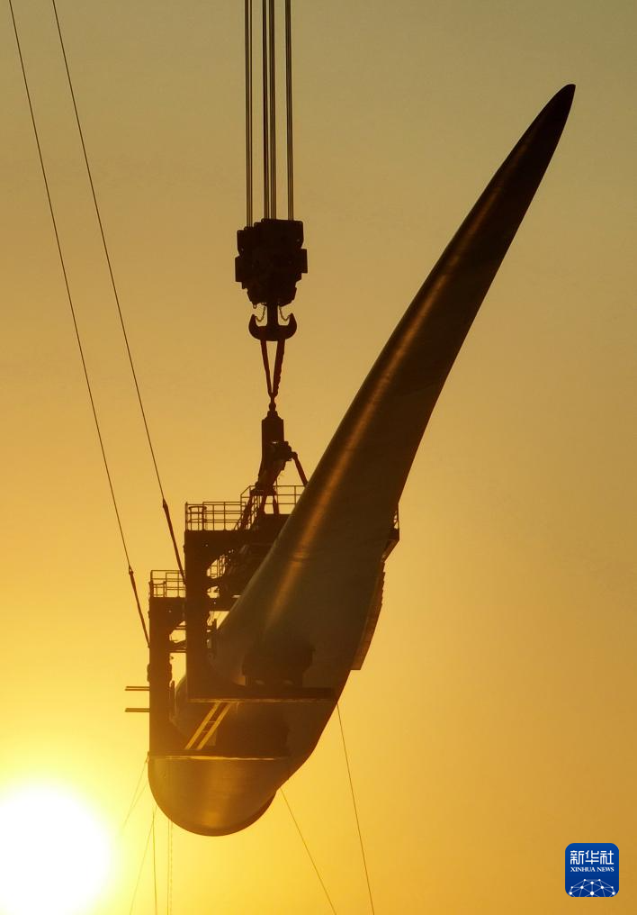 1月13日,在•▷▪“大桥海风”号2000吨自升式海上风电安装平台上,20兆瓦风机叶片在进行吊装(无人机照片)。新华社记者 林善传 摄