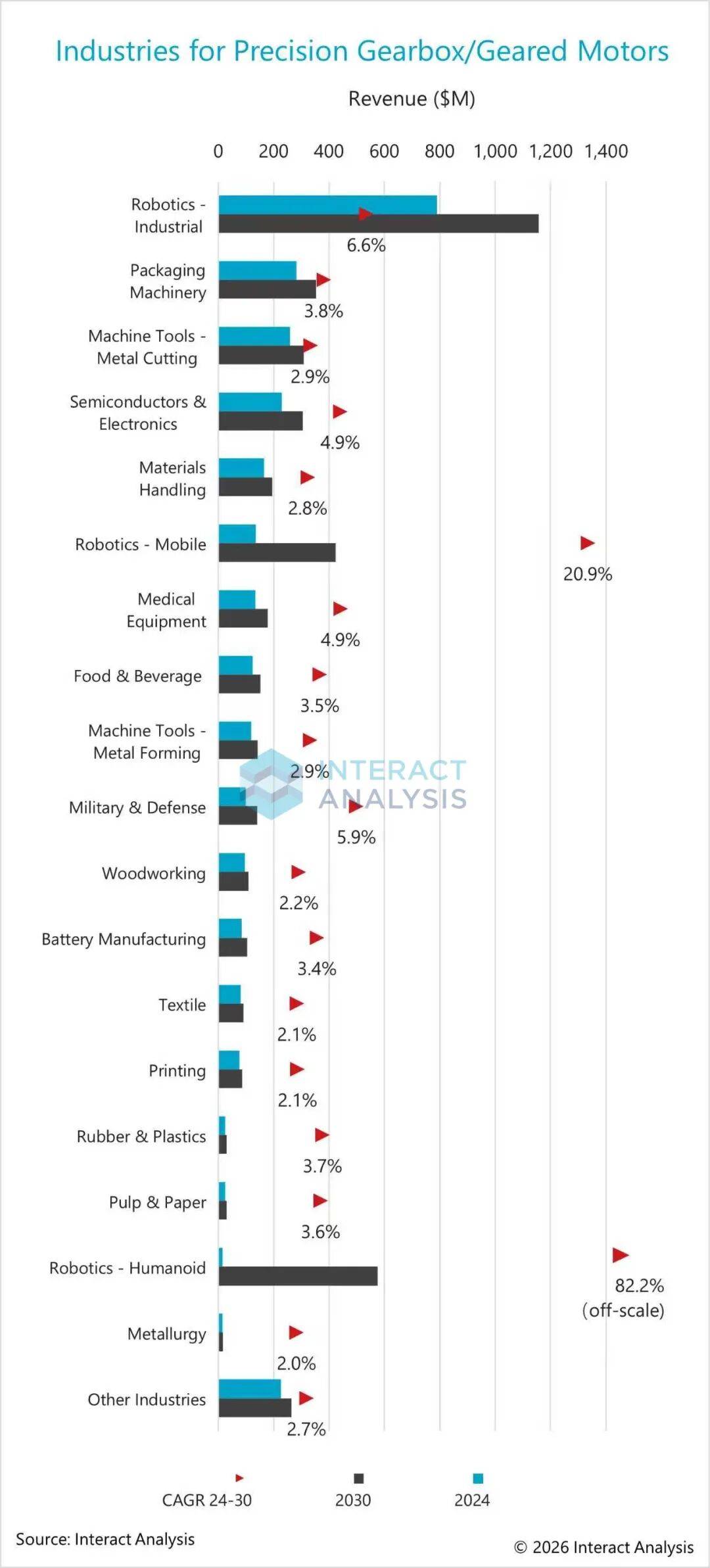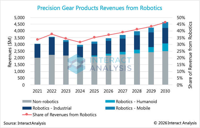 2025年的关税压力及贸易不确定性导致部分大型投资项目延期,使得终端用户市场更倾向于分阶段部署自动化,而非一次性大规模投入•。即便如此,移动机器人仍是精密减速机销量增长的重要推动力。预计2025年该领域的精密减速机销售额同比增长 24…◁.5%,达到 1.7亿美元,到 2030年◁◆▪,这一市场规模有望超过4亿美元。根据预测数据,2025–2030年期间,精密减速机市场 18% 的新增收入将来自移动机器人行业。