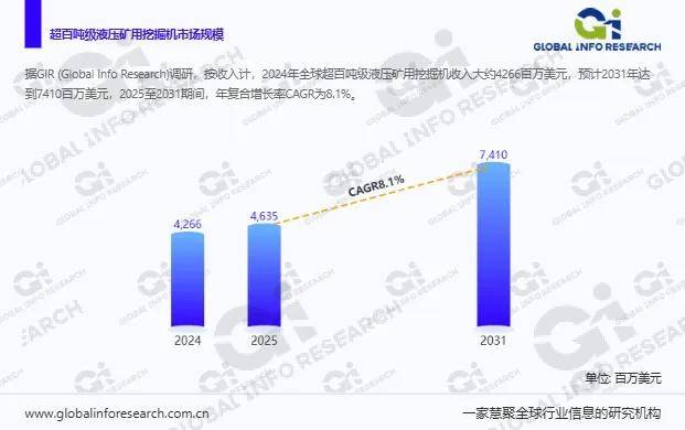 据环洋市场咨询(Global Info Research)调研团队最新报告《2025年全球市场超百吨级液压矿用挖掘机总体规模●□、主要生产商、主要地区、产品和应用细分研究报告--环洋市场咨询(Global Info Research)》显示,按收入计,2024年全球超百吨级液压矿用挖掘机收入大约4266百万美元,预计2031年达到7410百万美元,2025至2031期间,年复合增长率CAGR为8.1%。