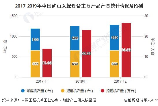 矿山采掘设备主要包括采煤机、掘进机、挖掘机等。2017-2019年我国采掘设备主要产品采煤机、掘进机=◁、挖掘机产量逐年上升。2019年采煤机、掘进机•○、挖掘机产量分别为630台、660台和26.63万台,分别同比上升5▪○△.00%、0.30%和14.70%。