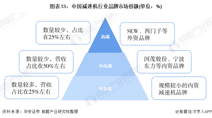 国内工业减速机市场逐渐呈现中低端两极分化趋势。随着下游制造业升级,多样化需求对减速机企业的综合实力提出了更高要求。2019年,德国SEW和西门子等高端品牌市场份额占比达到25%左右,国茂、宁波东力等国产中端品牌市场份额达50%,低端品牌占比约为25%…。