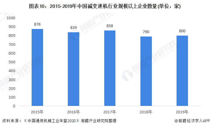 据《中国通用机械工业年鉴2020》公布的数据显示◁,2015-2019年我国减变速机行业规模以上企业数量波动变化☆▽。2019年★,我国减变速机行业规模以上企业数量为800家。