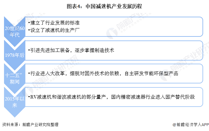减速机在我国的发展已有近40年的历史,广泛应用于国民经济及国防工业的各个领域。产品已从最初单一的摆线减速机,发展到现在的多品类…,即摆线减速机、无级变速器、齿轮减速机△●、蜗轮蜗杆减速机、电动滚筒等□★。减速机行业在中国主要经历了四个阶段,20世纪60年代 ☆△◁,我国建立了行业发展的标准,设立了专门生产减速机的生产厂;1978年后国家引进先进加工装备,通过引进、吸收国外先进技术和科研攻关▪◆▲,逐步掌握各种高速和低速重载齿轮装置的设计制造技术;十二五”期间节能减排环保型减速机取代高能耗、高污染、低效率减速机。行业进入大改革,摆脱对囯外技术的依赖=,自主研发节能环保型产品;2015年以来,《中国制造2025》要求突破突破机器人减速器等高端产品的技术,意味着减速机技术进入追赶期,随着国内RV减速机和谐波减速机的部分量产-○▼,国内精密减速器行业进入国产替代阶段。