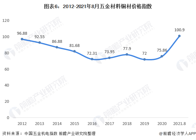 根据中国五金机电指数的铜材价格指数数据显示☆◇▪,2012-2021年国内铜材价格指数呈波动变化趋势。2012-2016年,铜材价格指数逐年下降○,从2012年的96.88下降至2016年的71.32。2017年后,铜材市场价格趋势波动不大,2020年价格指数为75.86。2019-2021年我国铜材价格不断攀升○▲◁,受原矿石价格上涨的影响,截至2021年8月底◆,2021年铜材价格指数为100.9,处于最近几年的高点。